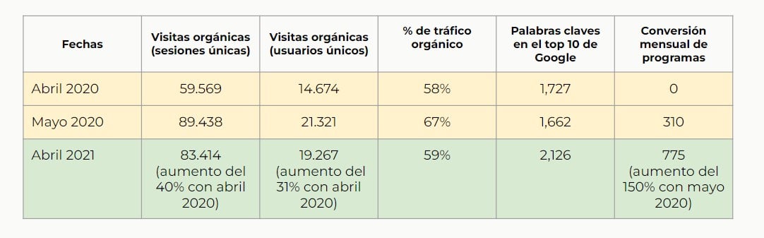2. En cuanto a los objetivos comerciales y de negocio, la universidad pasó de tener 10 leads anuales desde orgánico a 1.066 durante un año.