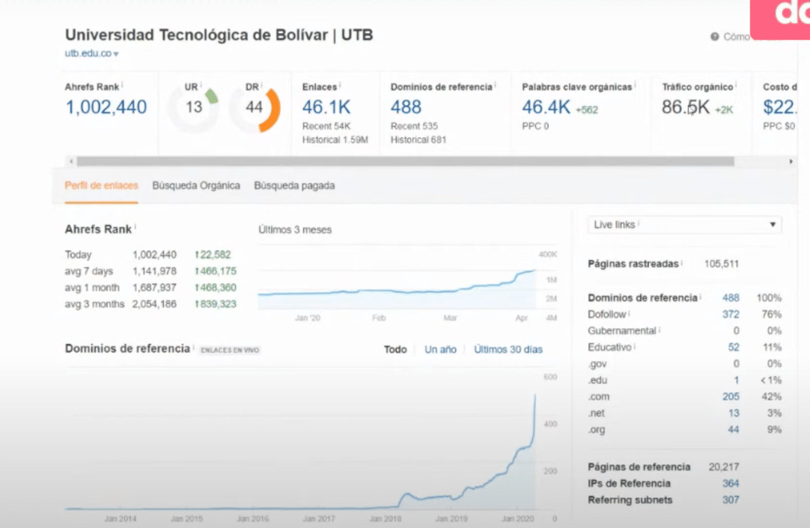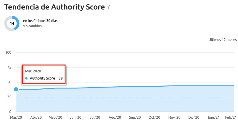 Desde comienzos del año 2020 se registraba una autoridad de dominio de 30/100, pero a comienzos del 2021, se puede registrar una autoridad de 44/100. Un resultado demasiado gratificante para un sitio que a nivel de negocio no solo quería impactar en las conversiones web, sino también en el ranking de webometrics.