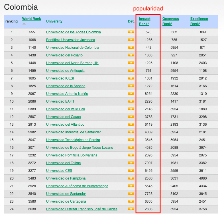 Del listado de universidades que se encuentran para Colombia, hay que identificar aquellos dominios que tengan mayor relevancia sobre la popularidad o el Impact Rank de Webometrics.