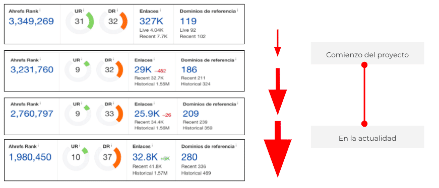 De la mano de métricas como la autoridad de dominio, también se notaron impactos positivos en dominios de referencia y backlinks (haciendo mucho énfasis es lograr enlaces de calidad de de gran cantidad)